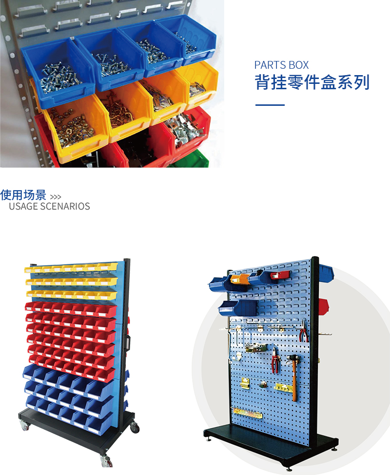 背掛零件盒采用全新共聚PP料制作,背后有掛槽設(shè)計,可懸掛于物料整理架和工作臺的掛板上使用。共5種規(guī)格,有紅、黃、藍3種顏色庫存。